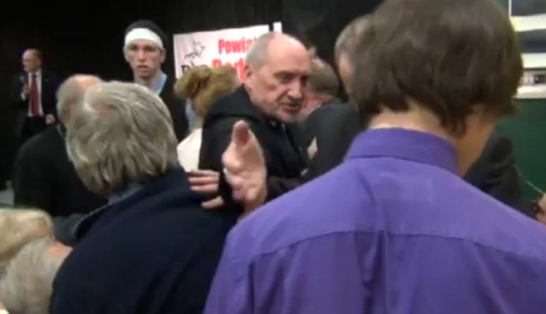 Wtedy zaczęła się awantura. Mężczyzna został zakrzyczany, wyrwano mu mikrofon, a inni uczestnicy spotkania bili go i popychali. Kłótnię próbował łagodzić Macierewicz, ale emocji nie potrafił powstrzymać współpracownik posła PiS.