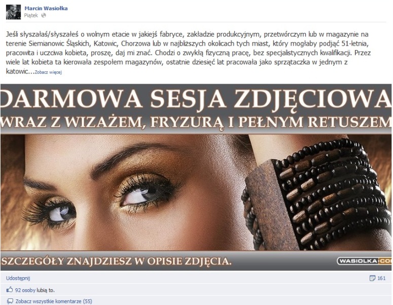 Takie ogłoszenie pojawiło się w piątek na Facebooku. Autor wpisu obiecuje, że jeśli czyjaś pomoc zaowocuje zatrudnieniem tej kobiety, w nagrodę zaproponuje darmową sesję zdjęciowa wraz ze stylizacją.