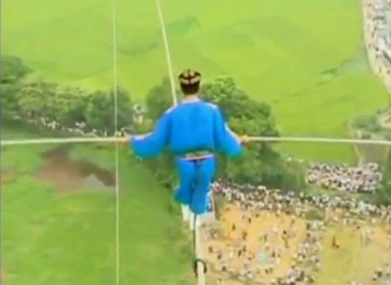 Wcześniej udało mu się przejść po linie rozwieszonej na wysokości 30-metrów nad ziemią, choć także się trzęsła. Występ był transmitowany w państwowej telewizji, a na miejscu oglądały go z zapartym tchem setki widzów.