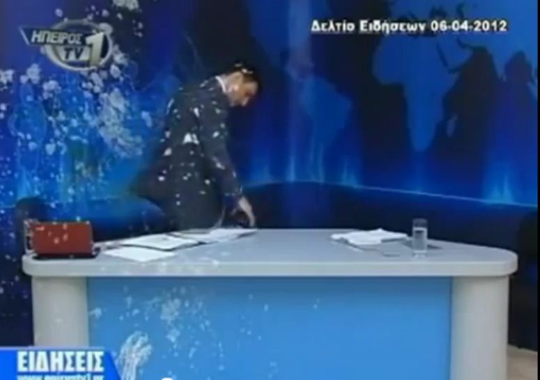 Grecki prezenter Panagiotis Bourchas został obrzucony jajkami i jogurtem podczas wywiadu, który prowadził w programie telewizyjnym na żywo.