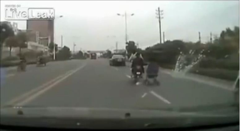 Prowadzenie wózka z dzieckiem po ruchliwej, dwupasmowej drodze to szczyt głupoty!