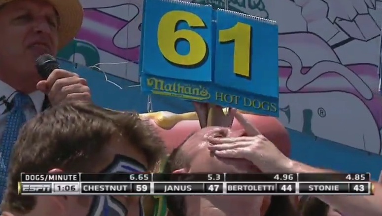 Jego uczestnicy udowodnili, że nie ma takiej ilości hot dogów, których nie są w stanie zjeść. Zobaczcie jak Joey Chestnut zjada 68 hot dogów w 10 minut. Chestnut wygrywa każdy konkurs Nathan od 2007 r. Rekord 68 hot dogów na minutę ustanowił w 2009 r. , a w tym roku był niepocieszony, że nie udało mu się pobić własnego rekordu i zjeść 70 hot dogów.