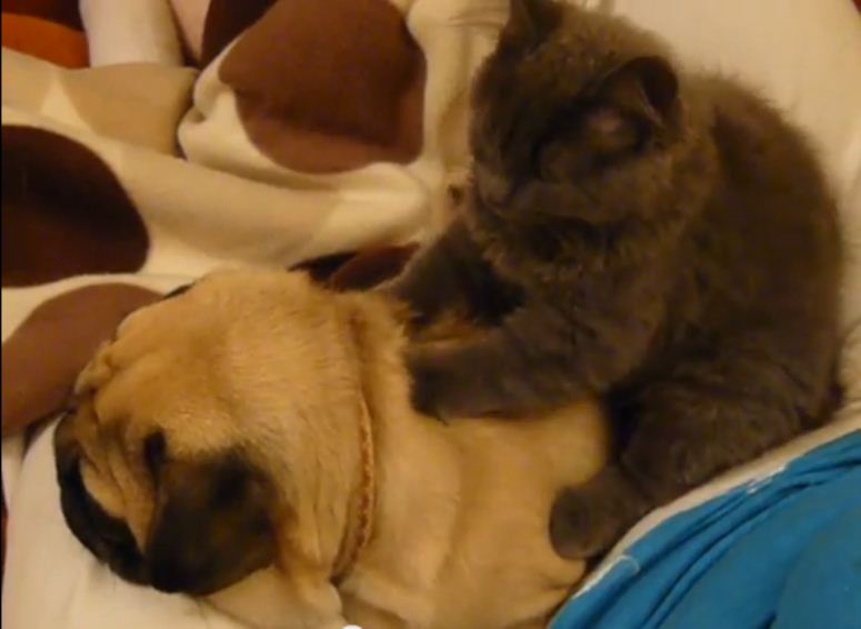 Kot masuje chrapiącego mopsa