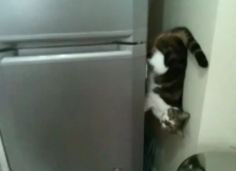 Kotek postanowił zmieścić się między ścianą, a lodówką i zejść.