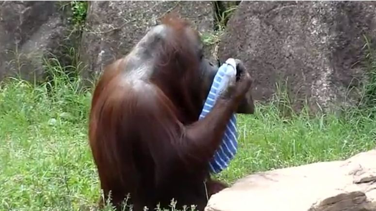 Uff, jak gorąco … prawda? Orangutan w japońskim zoo wpadł na świetny pomysł. Postanowił schłodzić się wilgotną szmatką w podobny sposób jak robią to ludzie. Sprytny zwierzak moczy kilkakrotnie szmatkę w wodzie, a potem przykłada ją do czoła.