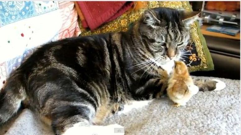 Kot ma anielską cierpliwość do pisklaka, który go zaczepia i usilnie próbuje wyprowadzić z równowagi.
