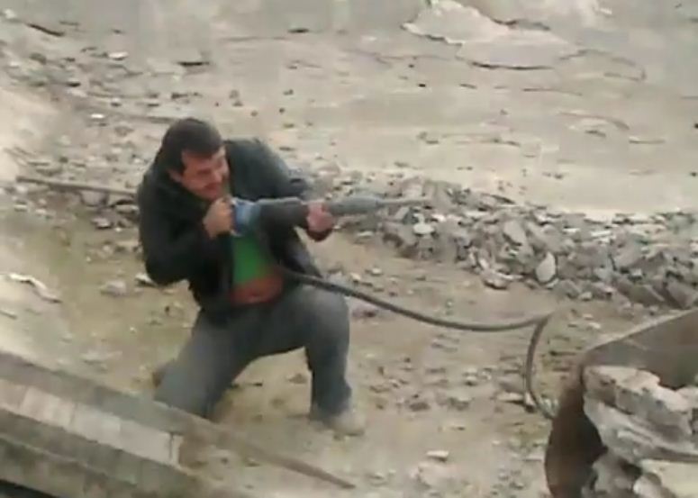 Panowie urządzili sobie na budowie retrospekcję II wojny światowej z wykorzystaniem młotów pneumatycznych.