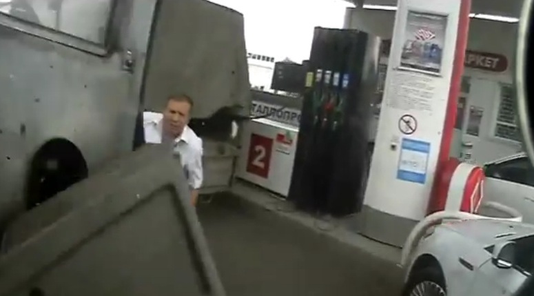 Następnie wjechał na stację paliw wprost na mężczyznę, który akurat tankował paliwo. Na szczęście autobus uderzył w zaparkowaną przy dystrybutorze ciężarówkę, co prawdopodobnie uratowało życie mężczyzny. Całe zdarzenie zarejestrowała kamera umieszczona w autobusie.